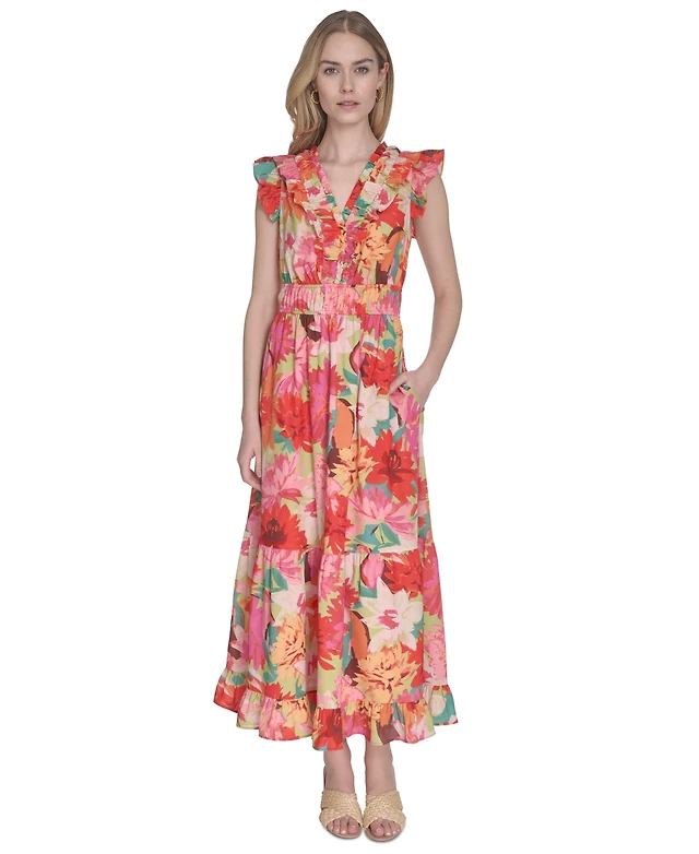 Vince Camuto Women's Floral-Print Ruffled-Shoulder Dress