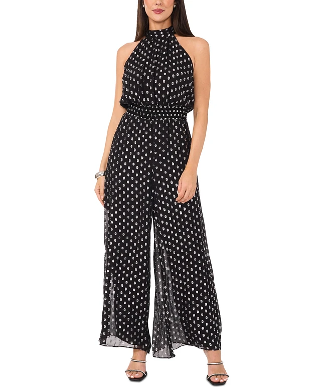 Vince Camuto Women's Foil Dot Halter Smocked-Waist Wide-Leg Jumpsuit