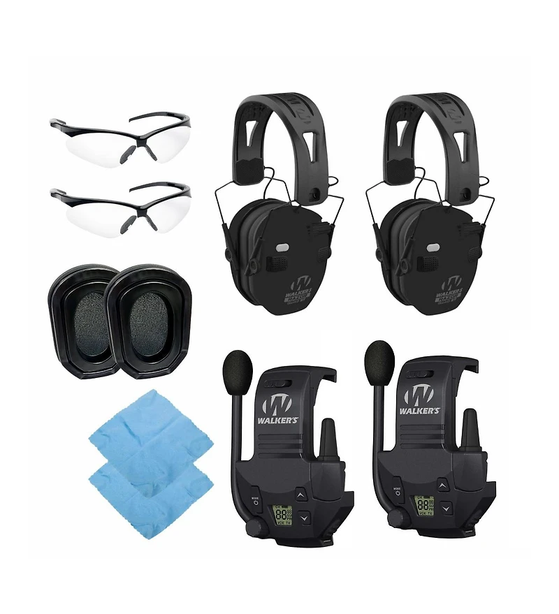 Bluetooth sync with mobile devices. This set contains 2 x Walker's Razor Slim Quad Electronic Earmuffs with Ultra Low Profile Ear Cups (Black), Limited 1-Year Warranty, 2 x Walker's Razor Tactical and Hunting Walkie Talkie Attachment, 2 x Aaa Batteries, 2 x Walker s Gel Ear Pad for Razor and Xcel Series Muffs with Comfortable Design (Black), and a Limited 1-Year Warranty.