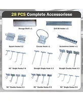This wall-mounted pegboard organizer is crafted from reinforced metal for durability. It includes 28 accessories for customizable tool storage, optimizing your workspace and keeping everything within easy reach.