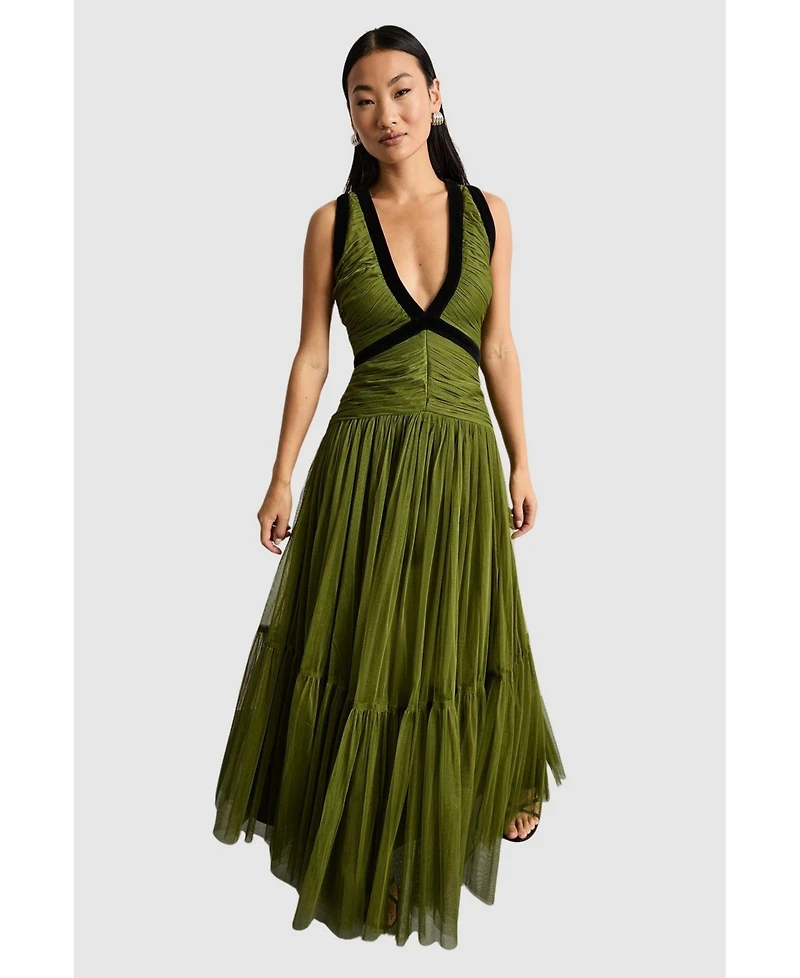 Make a captivating entrance in this Warehouse Petite Velvet Trim Tulle Maxi Dress, designed for those who appreciate distinctive details. The plunging V-neckline framed with luxurious velvet trim creates a striking focal point, while the expertly ruched bodice sculpts and flatters.