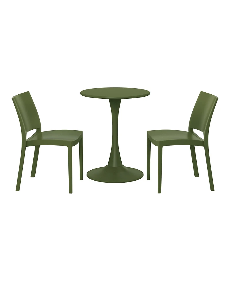 Elevate your outdoor gatherings with this two person dining table set. The round dining table, crafted from a durable metal material has a rust-resistant e-coating that ensures the tables longevity and has a wide flat base to reduce wobbling and promotes stability. Complementing the table are two stackable patio chairs, designed for space-conscious living. Made from Uv-resistant polypropylene resin, these lightweight chairs allow for effortless rearrangement, adapting to your evolving patio aesthetic. The patio dining chairs curved backrest and seat offers a more comfortable design and the open backrest promotes better airflow to keep you cool during the warmer days. Enjoy instant gratification with the fully assembled chairs, while the table's assembly allows for quick setup, making it the perfect centerpiece for your outdoor retreat ensuring this 3-piece round patio dining table set for 2 is the perfect set for your patio this season.