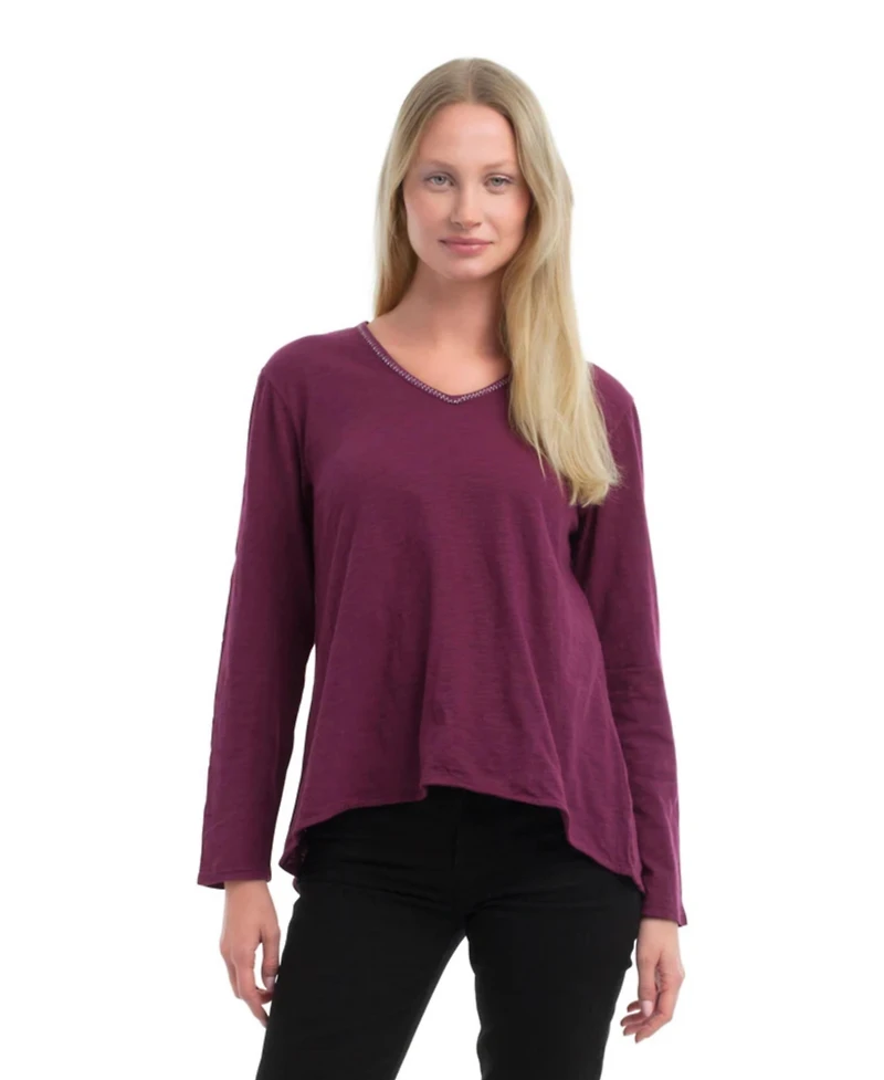 V-Neck Long Sleeve Tee with Metallic Thread DetailA classic silhouette with a subtle shine. Designed in our signature slub fabrication, this long-sleeve tee features metallic thread accents along the neckline for a touch of effortless elegance. Soft, breathable, and easy to style—perfect for elevating your everyday essentials. V-neckline with metallic thread detailing Signature slub fabrication 100% cotton Machine washable Imported Model is wearing a size Small