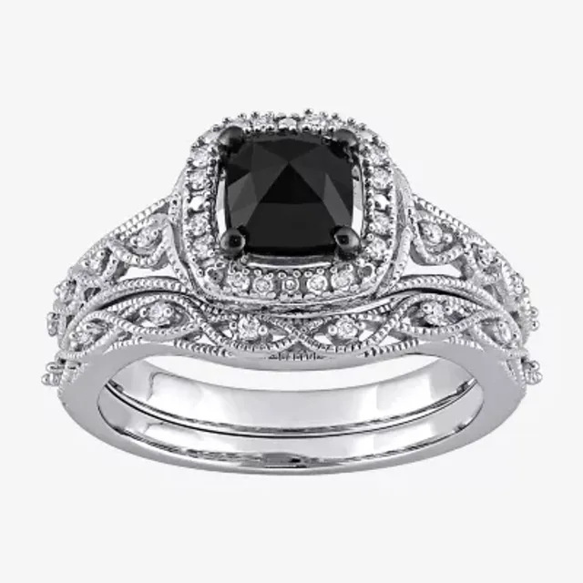 Womens 1 1/2 CT. T.W. Natural Black Diamond 10K White Gold Cushion Side Stone Halo Bridal Set