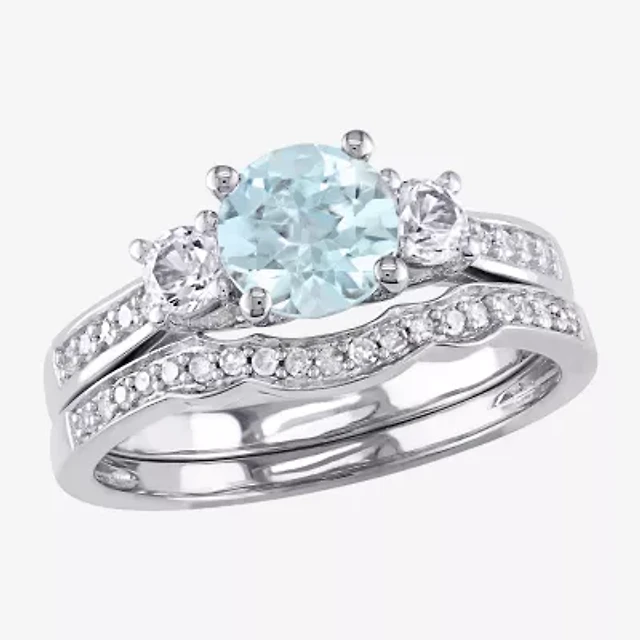 Womens 1/7 CT. T.W. Genuine Blue Aquamarine 10K White Gold Round Side Stone 3-Stone Bridal Set