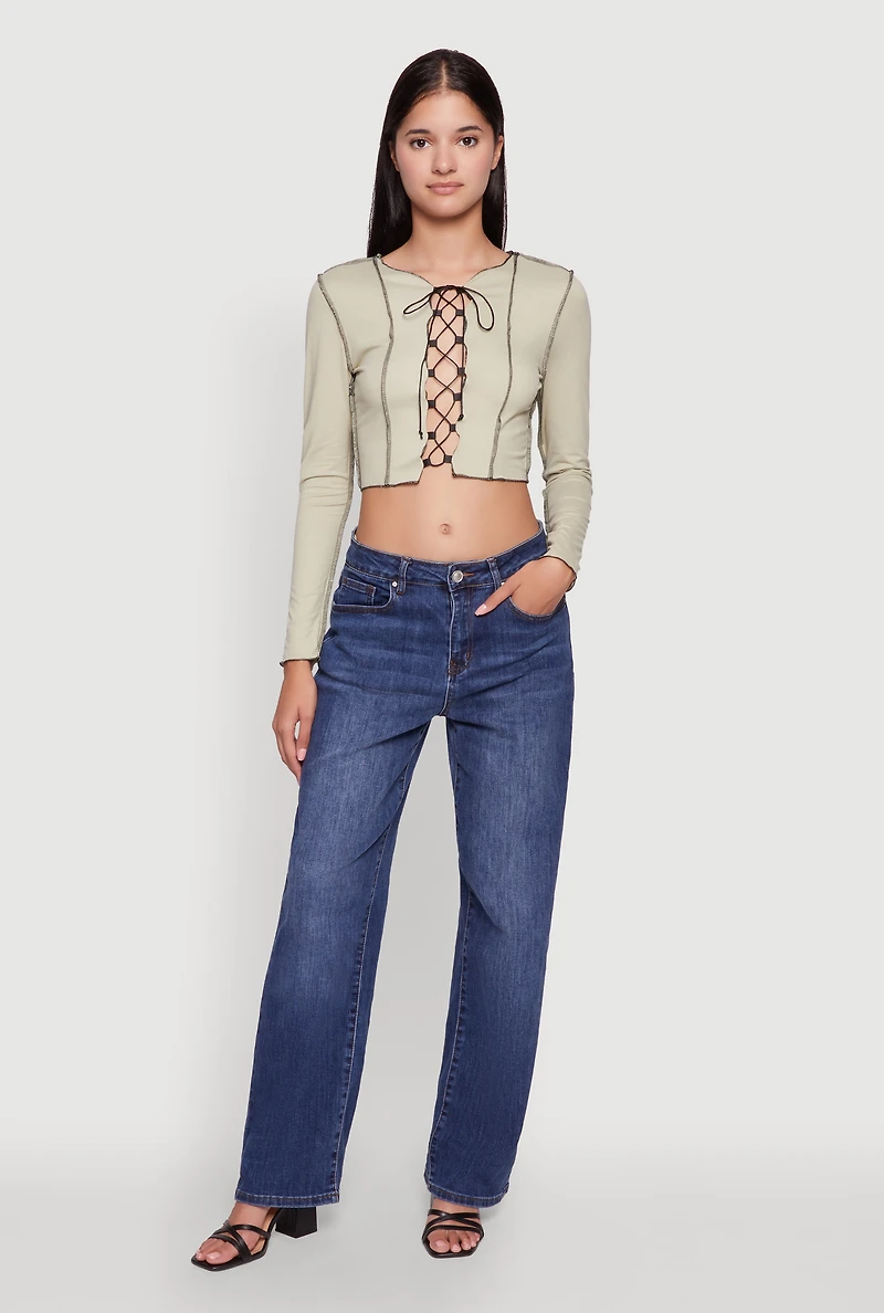Step into effortless style with the brushed knit lace-up long sleeve crop blouse. This classic fit top features a cozy brushed knit fabric that feels as good as it looks. The high neck adds a chic touch while the lace-up detail brings just the right amount of edge to your casual streetwear vibe. Perfect for layering or rocking solo, this crop blouse is your new go-to for laid-back days and cool nights. Soft brushed knit fabric for all-day comfort classic fit with a timeless silhouette high neck design for a sleek, modern look lace-up detail adds trendy streetwear flair long sleeves keep it cozy and versatile crop length perfect for pairing with high-waisted bottoms ideal for casual outings and everyday wear model pictured wearing size sheight 5 ft 9 in, bust 32 in, waist 24 in, hips 34 infits true to sizecontent and care material: 92% polyester, 8% spandex care instructions: hand wash country of origin: vietnam rainbow item number 3402058752247