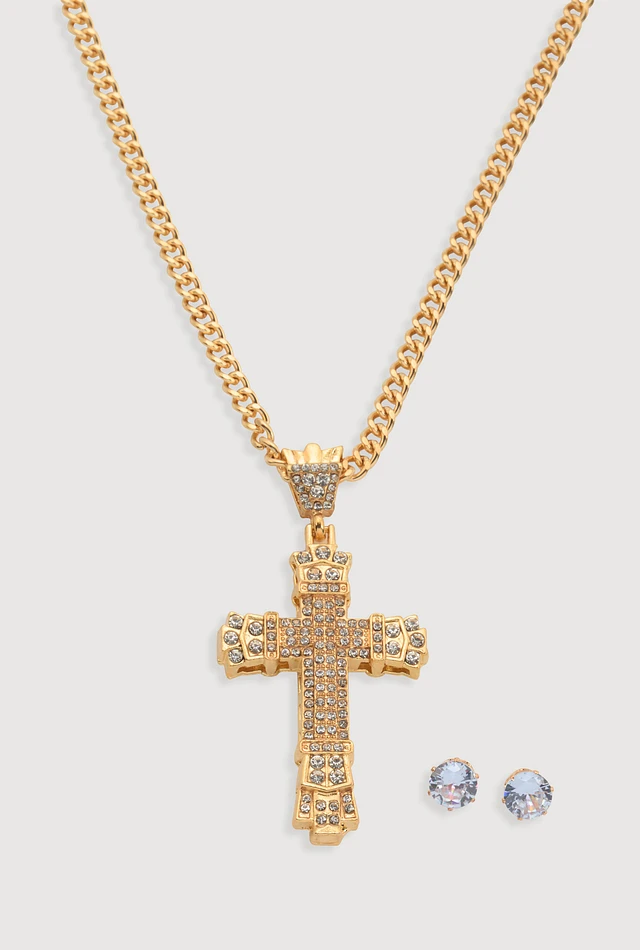 Womens Cubic Zirconia Cross Chain Necklace and Stud Earrings, Gold
