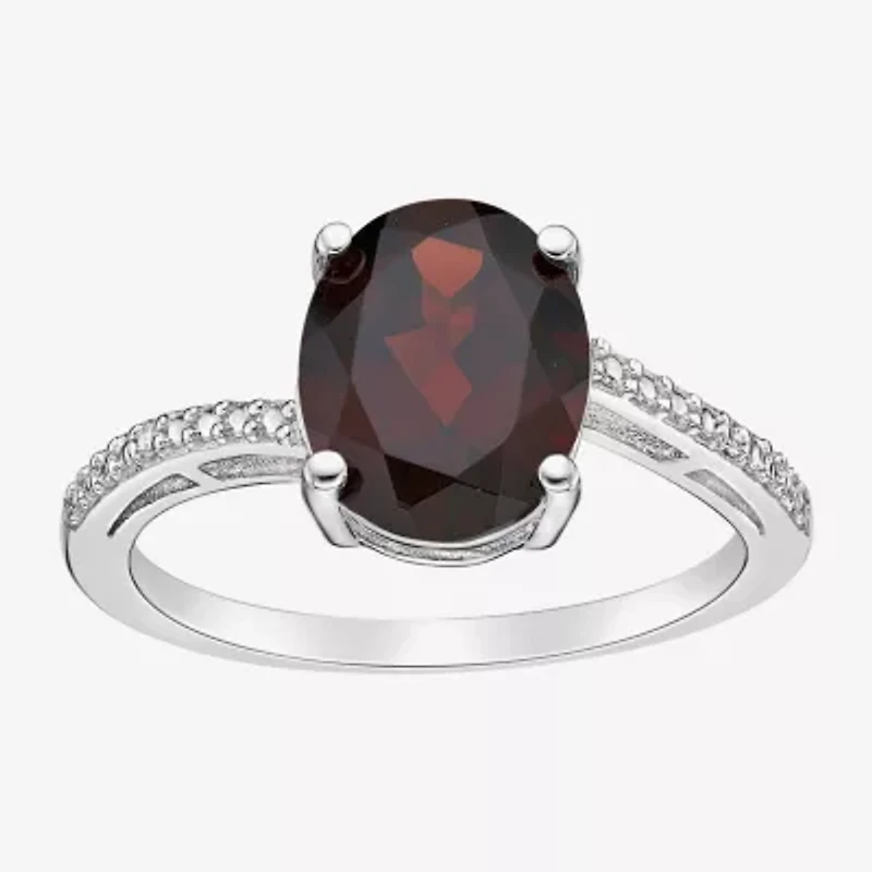 Womens Diamond Accent Genuine Red Garnet Sterling Silver Oval Side Stone Cocktail Ring
