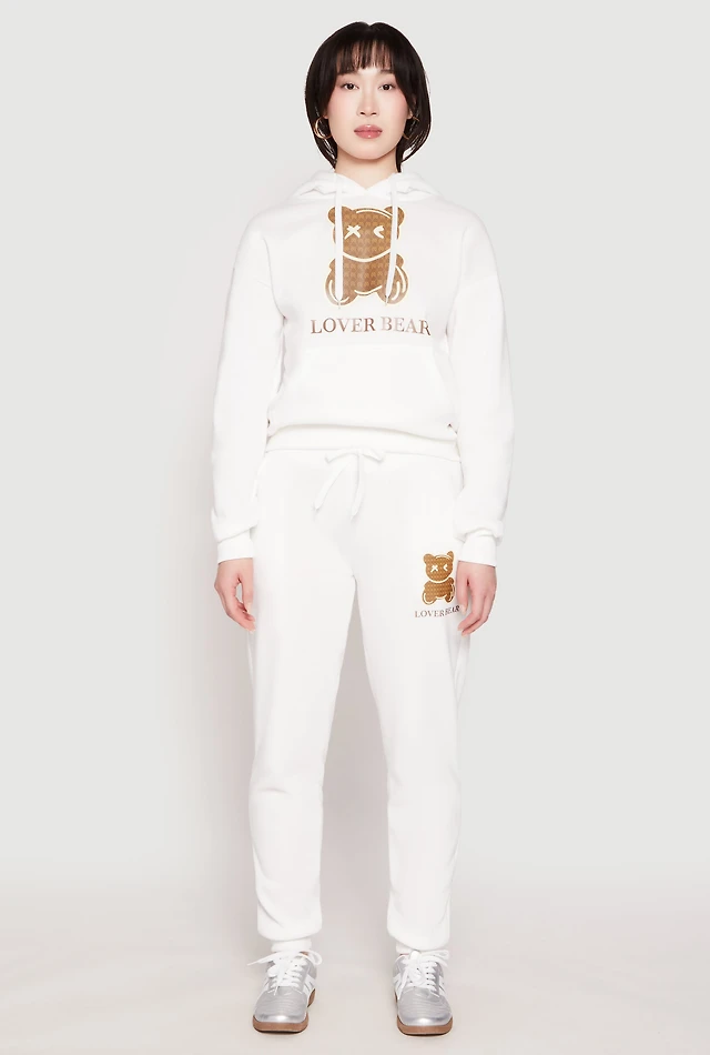 Womens Fleece Lover Bear Graphic Joggers, White, Size L