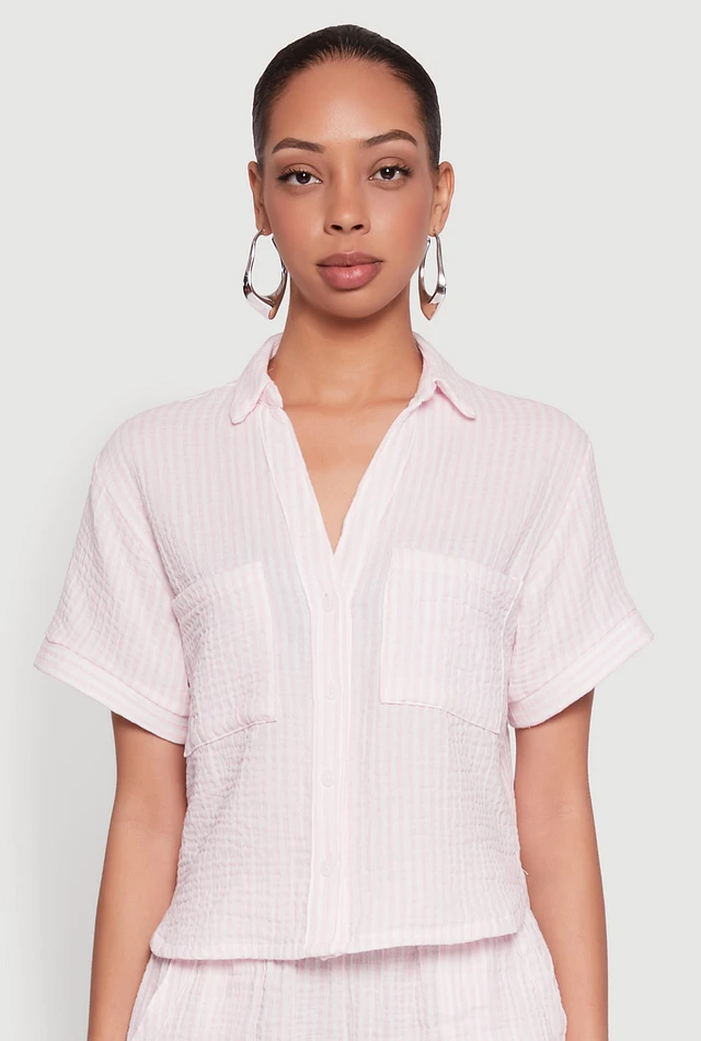 Womens Gauze Knit Striped Shirt, Pink, Size M