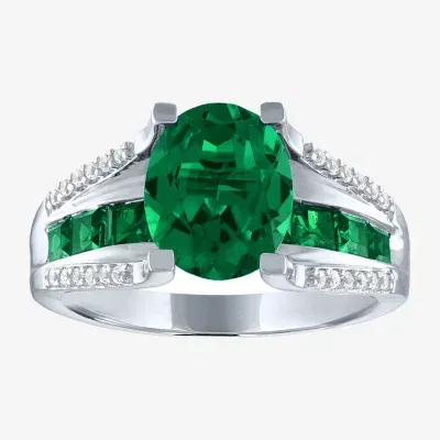 Womens Lab Created Green Emerald Sterling Silver Oval Side Stone Cocktail Ring