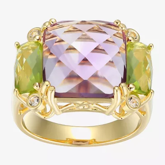 Womens Genuine Purple Amethyst 18K Gold Over Silver Square 3-Stone Cocktail Ring