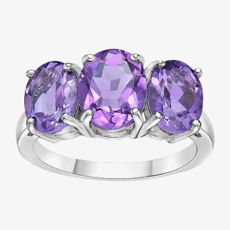 Womens Genuine Purple Amethyst Sterling Silver Oval 3-Stone Cocktail Ring