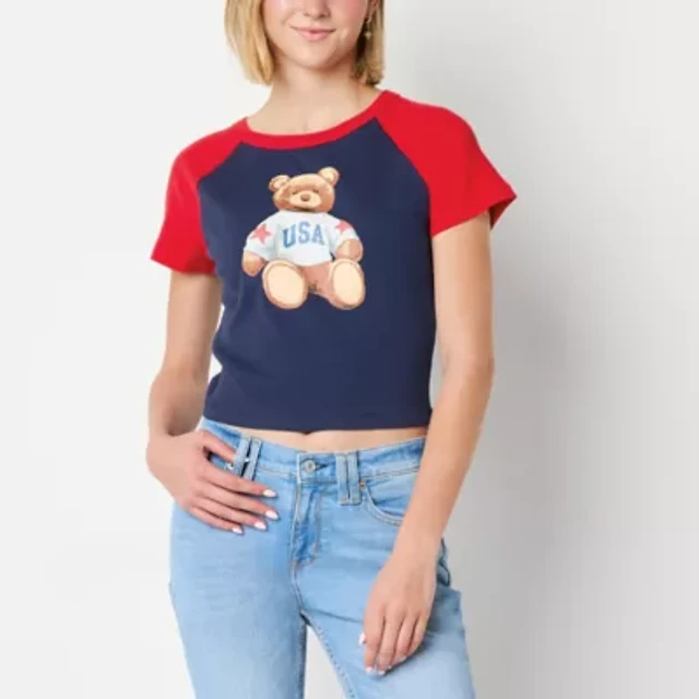Womens Juniors Crew Neck Short Sleeve Fitted Graphic T-Shirt