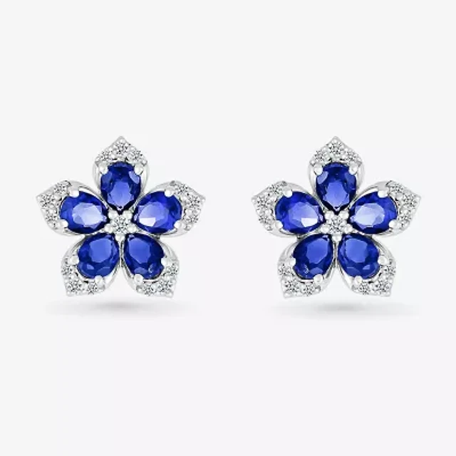 Womens Lab Created Blue Sapphire & 1/5 CT. T.W. Genuine Diamond Sterling Silver 12.3mm Flower Stud Earrings