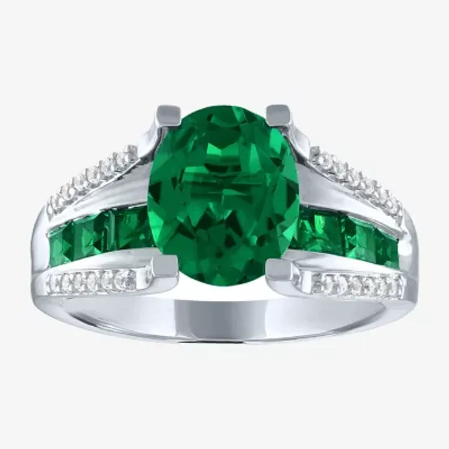 Womens Lab Created Green Emerald Sterling Silver Oval Side Stone Cocktail Ring