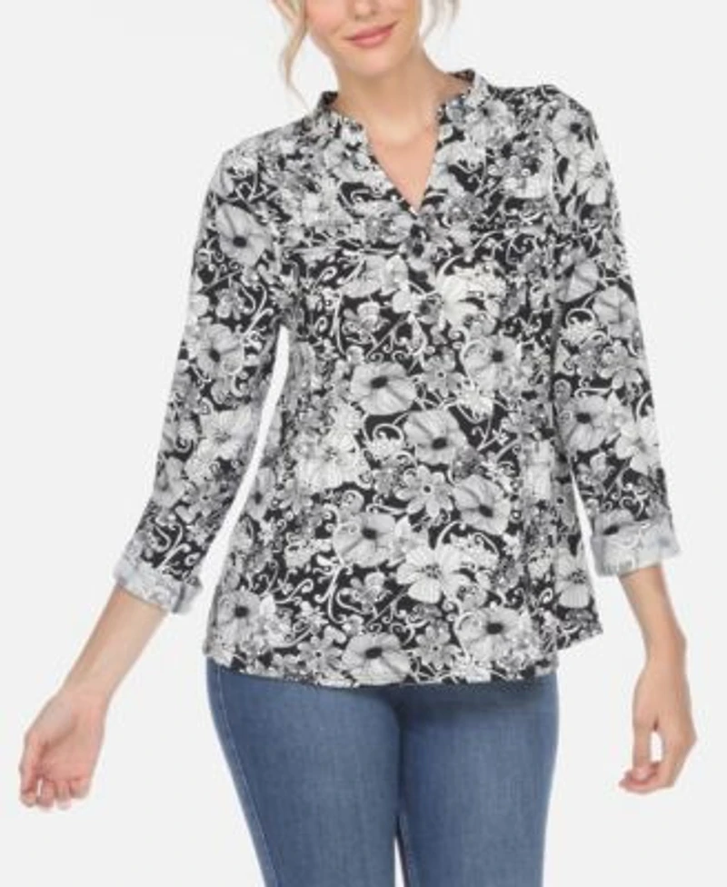 Indulge in this relaxed light weight tunic top for a classic modern look. This long sleeve trendy floral print top features an open mandarin collar with a V-neck and button closure at chest, functional pockets, pin tuck pleats at front, yoke pleating back, and a rolled cuff with button tag closure.