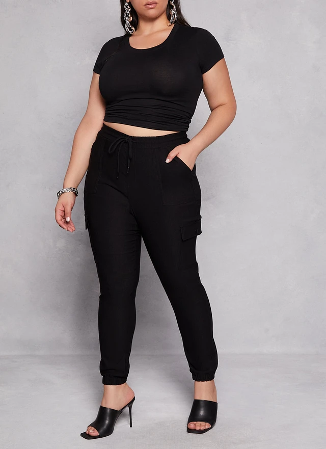 Womens Plus Size High Waisted Drawstring Waist Cargo Joggers, Black, Size 1X