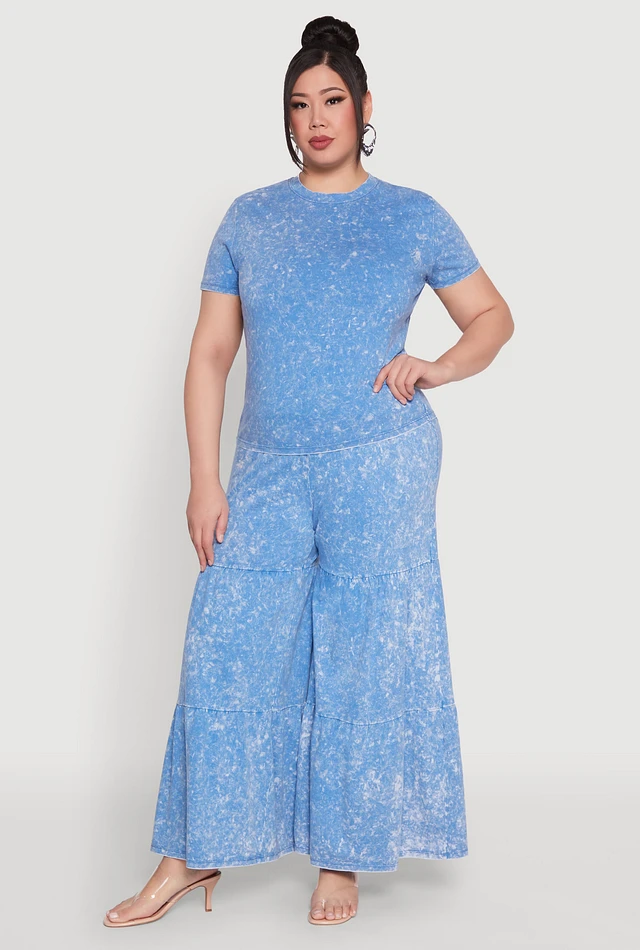 Womens Plus Size Mineral Wash Tiered Palazzo Pants, Blue, Size 3X