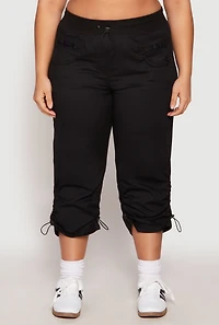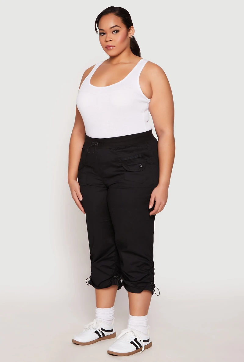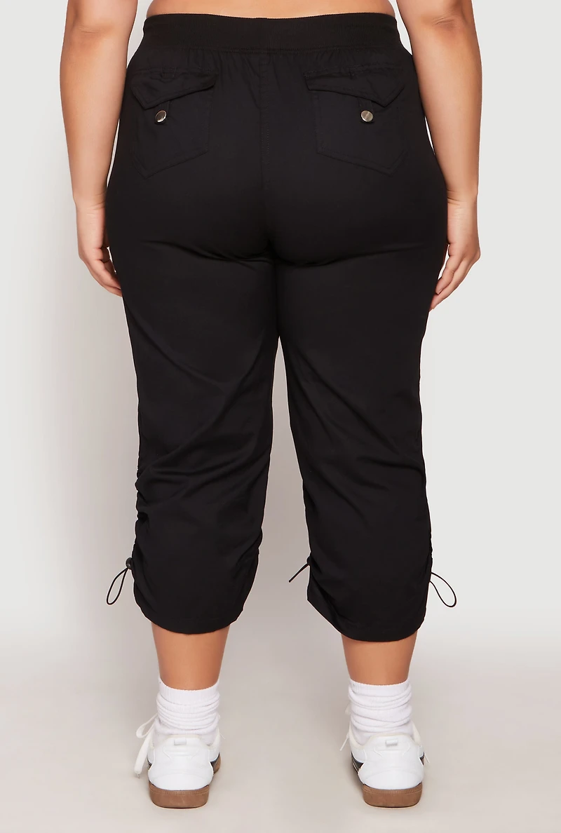Discover the perfect blend of comfort and style with our plus size poplin toggle drawstring capri pants. Designed for everyday wear, these capris are your new go-to for effortless casual chic. The toggle drawstring hem adds a playful touch, allowing you to customize the fit and style with ease. Whether you're lounging at home or heading out for a quick coffee run, these high-waisted pants will keep you looking fabulous and feeling confident all day long. Toggle drawstring hem for a customizable and trendy look high waisted fit for added comfort and flattering silhouette made from lightweight poplin fabric, perfect for warm days casual pant style that pairs easily with your favorite tops designed specifically for plus size for a comfortable, flattering fit ruching tag adds a stylish detail to elevate your everyday outfit model pictured wearing size 1xheight 5 ft 6 in, bust 42 in, waist 35 in, hips 49 infits true to sizemeasurementsinseam: 18. 5 incontent and care material: 97% cotton, 3% spandex care instructions: machine wash, lay flat to dry country of origin: bangladesh rainbow item number 1865038346204