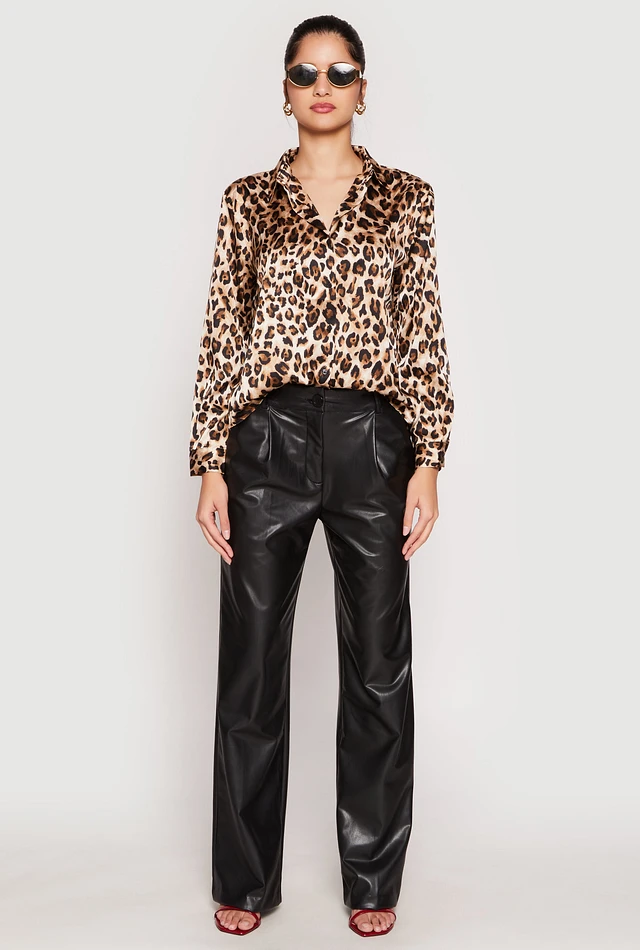 Womens Satin Leopard Print Button Front Shirt, Multi, Size S
