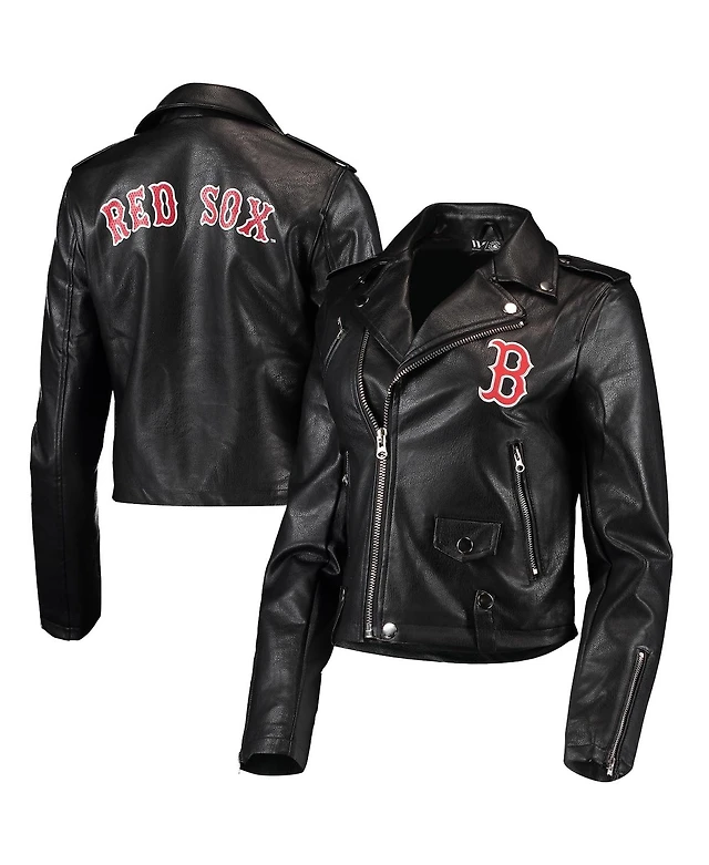 Women's The Wild Collective Black Boston Red Sox Faux Leather Moto Full-Zip Jacket