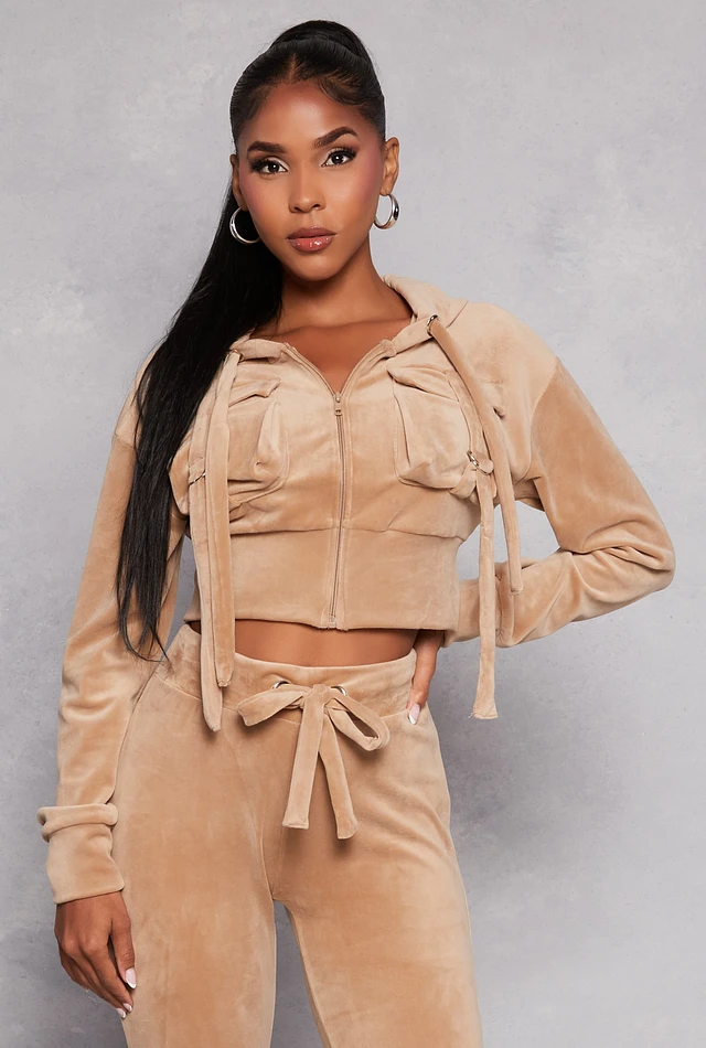 Womens Velour Flap Pocket Cropped Zip Front Hoodie, Beige, Size S
