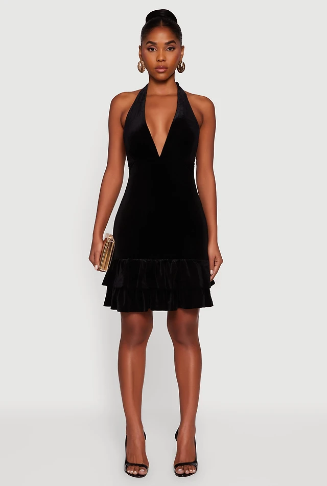 Womens Velvet Ruffle Tiered Tie Back Halter Dress, Black, Size M