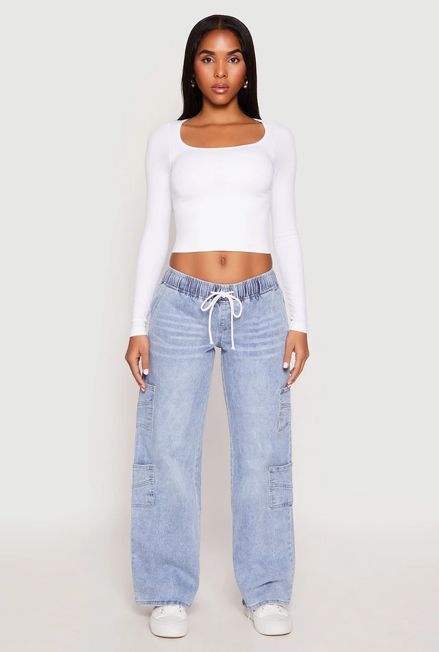 Womens VIP Acid Wash Elastic Waist Cargo Jeans, Blue, Size 7-8