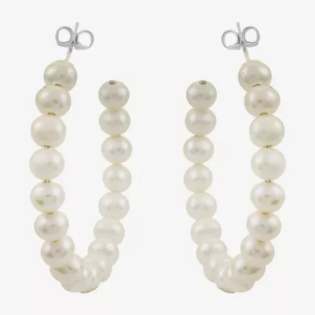Silver Treasures Womens Cultured Freshwater Pearl Sterling Silver 35mm Hoop Earrings