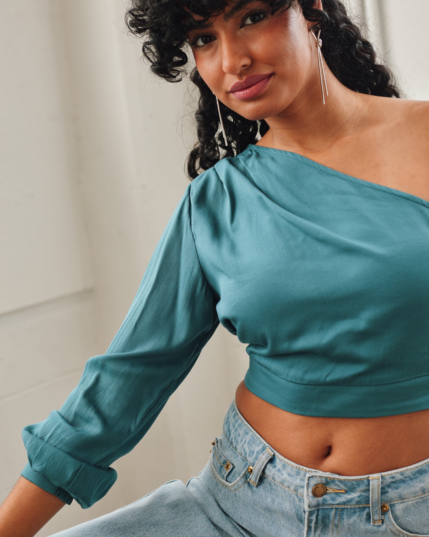 This soft and versatile off the shoulder design features one long sleeve. With a cinched waist, this simple top is perfect for any occasion.