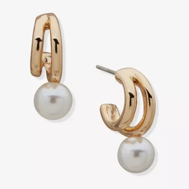 Worthington Gold Tone Single Bead Huggie Womens Simulated Pearl 20.3mm Hoop Earrings