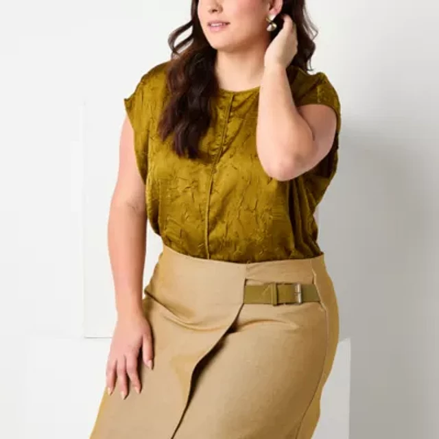 Worthington Plus Womens Crew Neck Short Sleeve Satin Blouse
