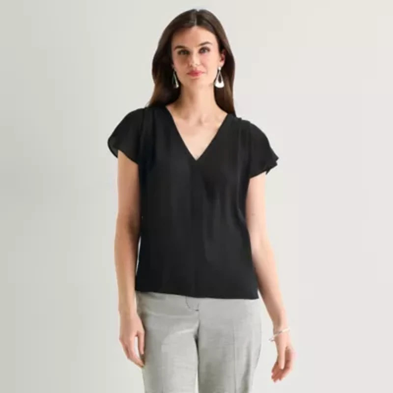 Worthington Womens Petite V Neck Short Sleeve Blouse