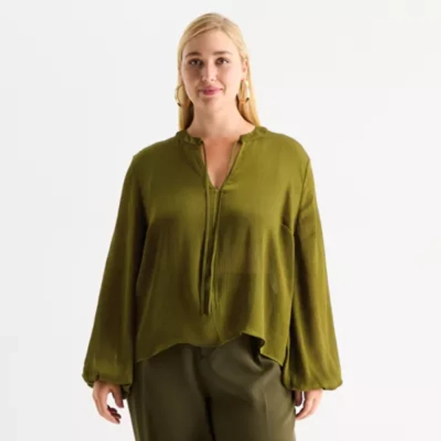 Worthington Womens Plus Split Tie Neck Long Sleeve Blouse