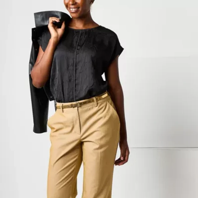 Worthington Womens Round Neck Short Sleeve Satin Blouse