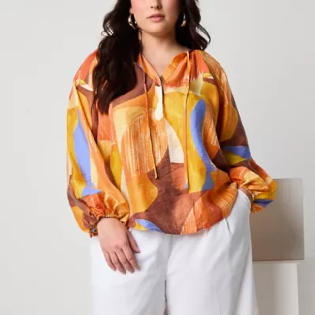 Worthington Womens Split Tie Neck Long Sleeve Plus Blouse