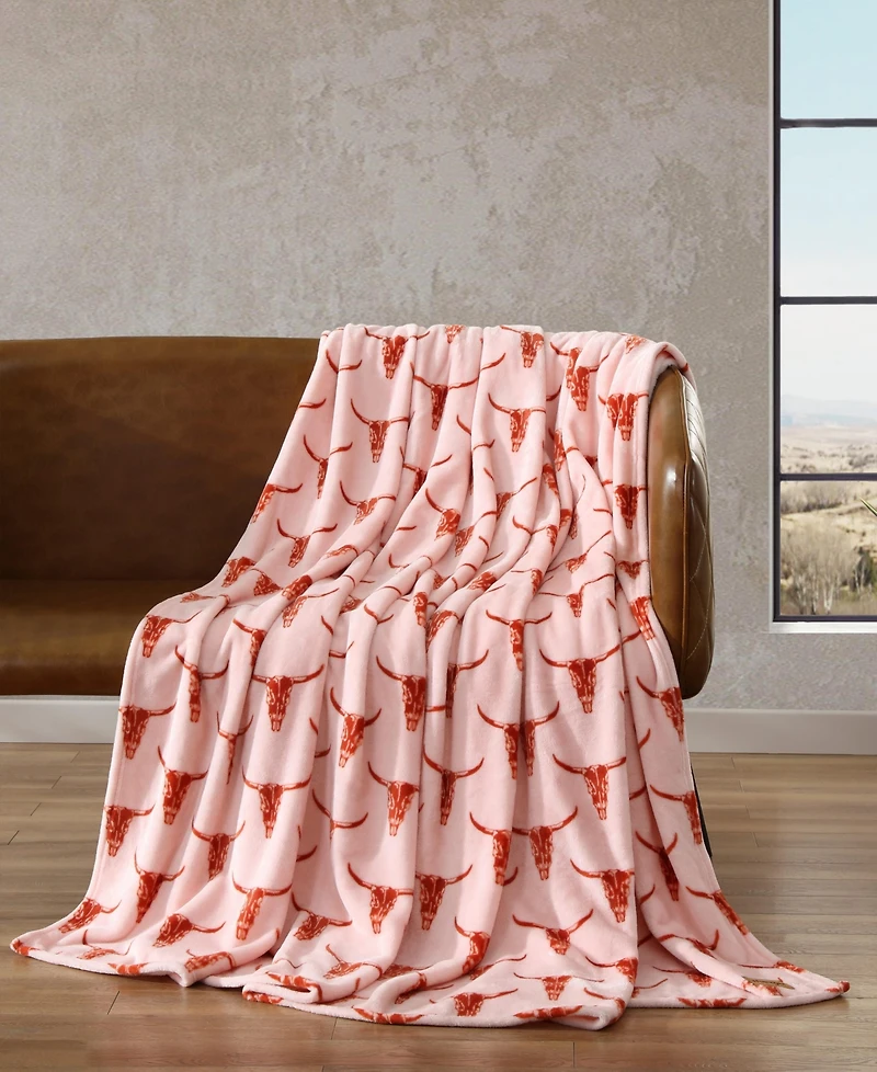 The Wrangler Steerhead blanket collection showcases the shade of blanket, featuring a bold longhorn skull motif in a southwestern rustic design. The soft, luxurious feel adds warmth and elegance, perfect for those who value both style and comfort.