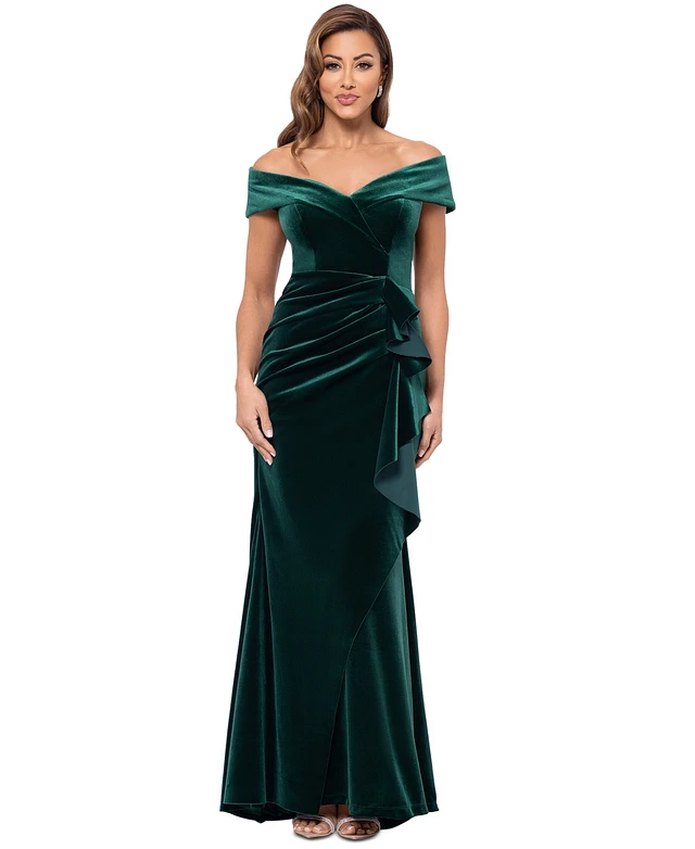 Xscape Petite Ruffled Off-The-Shoulder Velvet Gown