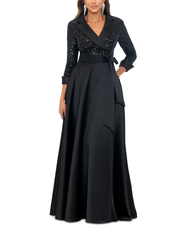 Xscape Women's Sequined Tuxedo Belted Ball Gown