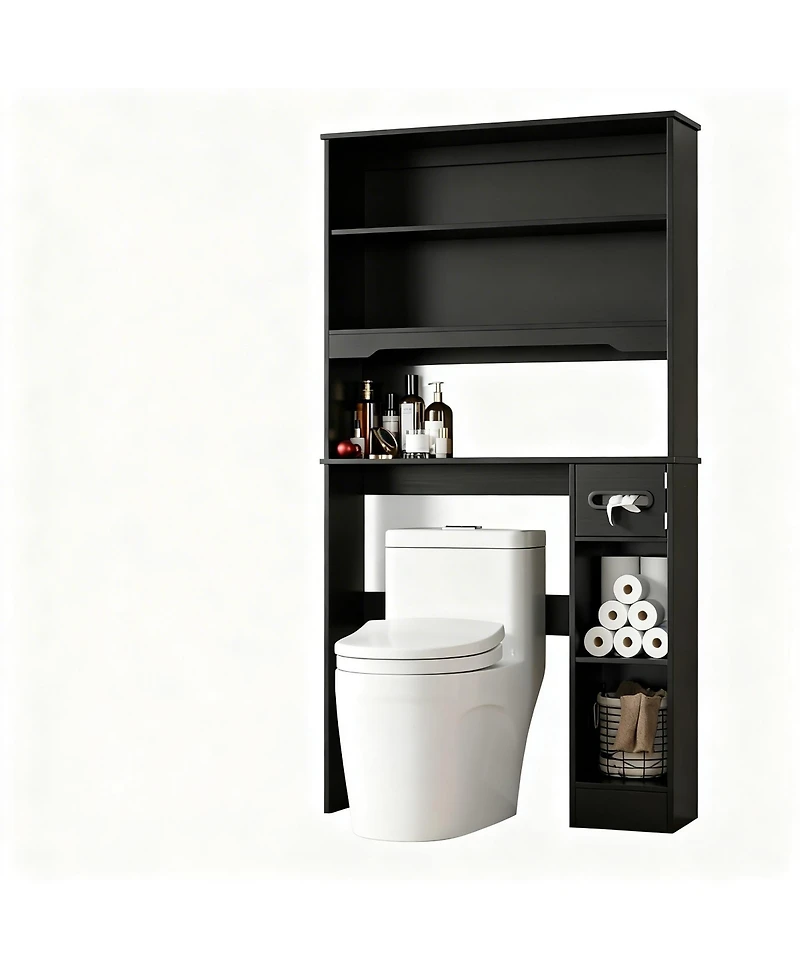 Maximize Vertical Storage Space: This over-the-toilet storage cabinet features three roomy shelves for bathroom and laundry essentials, efficiently storing toiletries and towels while utilizing vertical space over the toilet. Versatile and Space-Saving: Perfectly sized for standard toilets, this slim unit works in bathrooms, laundry rooms, or compact areas. Stylish Design with Smart Features: Features glass doors and a built-in tissue dispenser with adjustable shelves for customized storage. Secure Construction: Includes an anti-tip kit for wall anchoring. Effortless Setup: Numbered parts, pre-drilled holes, and simple instructions enable quick assembly. Weight: 0.06 pounds. Length: 7.90 inch. Width: 35.00 inch. Height: 68.10 inch.