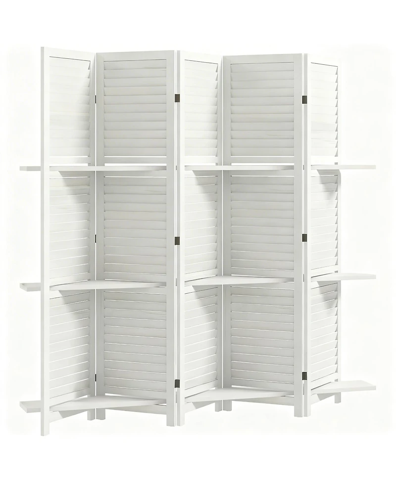 Classic five-panel room divider in paulownia wood with louvered slats gives living or work areas quick privacy. Three removable shelves hold photos, plants or small decor. Twelve steel hinges let the screen fold flat for storage or moving. Raised feet keep air and moisture away from the floor and padded tips prevent scratches. Open size 78.75 x 67 x 0.75 in, folds to 15.75 x 67 x 3 in. Weight: 0.03 pounds. Length: 63.25 inch. Width: 78.76 inch. Height: 67.00 inch.