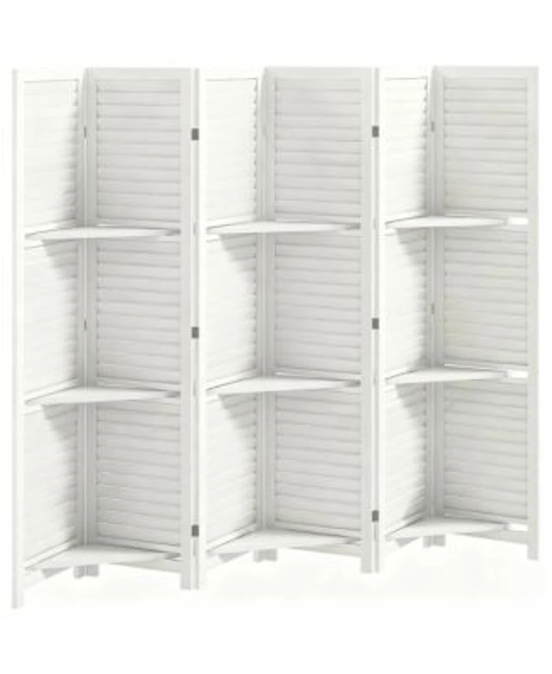 Classic six-panel wood screen with angled slats gives living or work areas quick privacy. Three snap-out shelves hold photos, small plants or decor. Fifteen steel hinges let the panels fold flat for storage or moving. Raised feet keep air and moisture away from the bottom soft pads stop floor scratches. Open size 94.5 x 67 x 0.75 in, folds to 15.75 x 67 x 4.5 in. Weight: 0.03 pounds. Length: 70.75 inch. Width: 94.50 inch. Height: 67.00 inch.