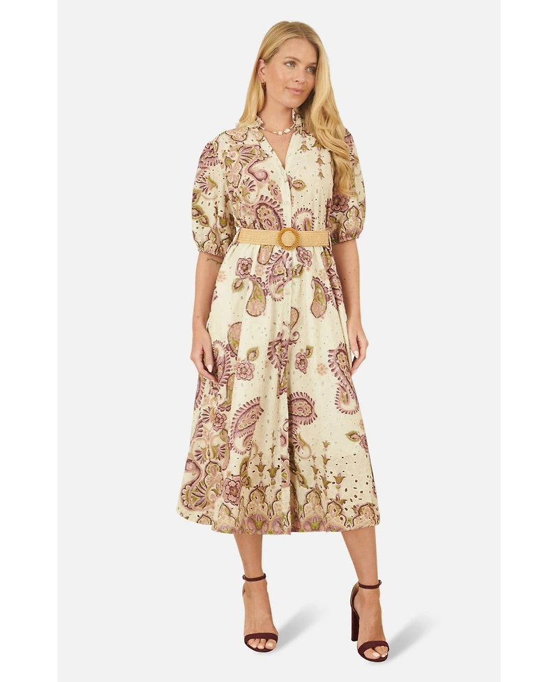 Having a love affair with beautiful textures and prints for the summer? Same! This shirt style midi dress from Yumi has been lovingly designed in house to give an elegant feel. With an all over soft paisley print and button up design framed in puffed 3/4 sleeves with the finishing touch of a woven belt to complete the look. Made from cotton broderie anglaises style fabric for a summer feel.