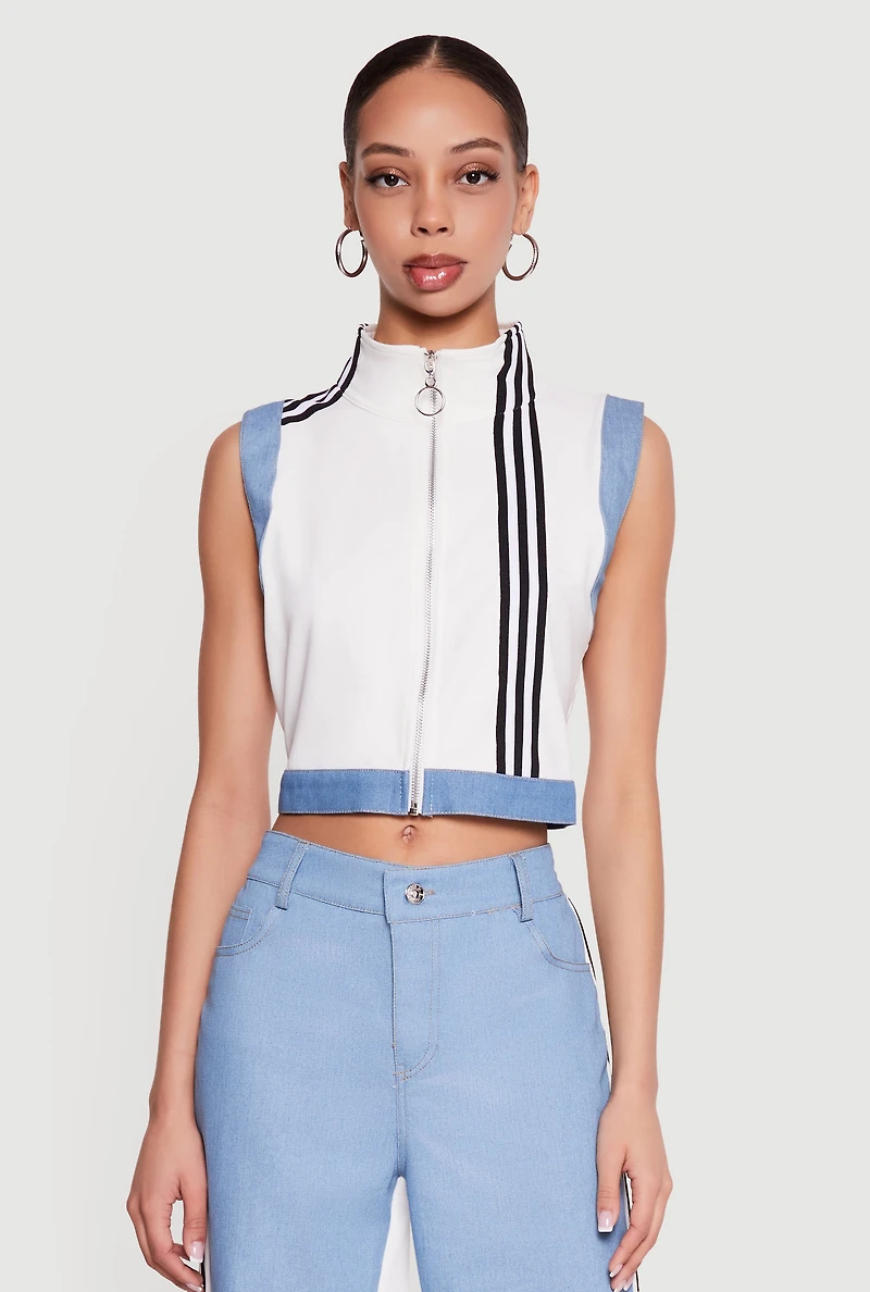 Zip Front Denim Trim Mock Neck Vest