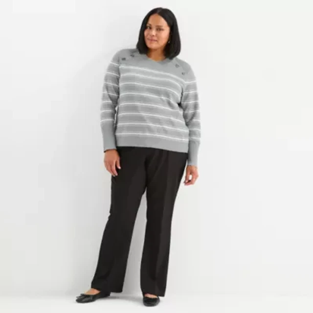 Liz Claiborne Womens Crew Neck 3/4 Sleeve Striped Pullover Sweater
