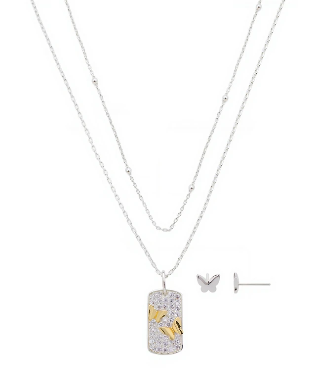 Unwritten Cubic Zirconia Butterfly Tag Pendant Layered Necklace and Earring Set